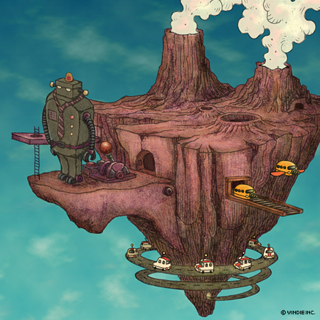 ロボット、噴煙、飛行バス、車をアニメーションで制作。