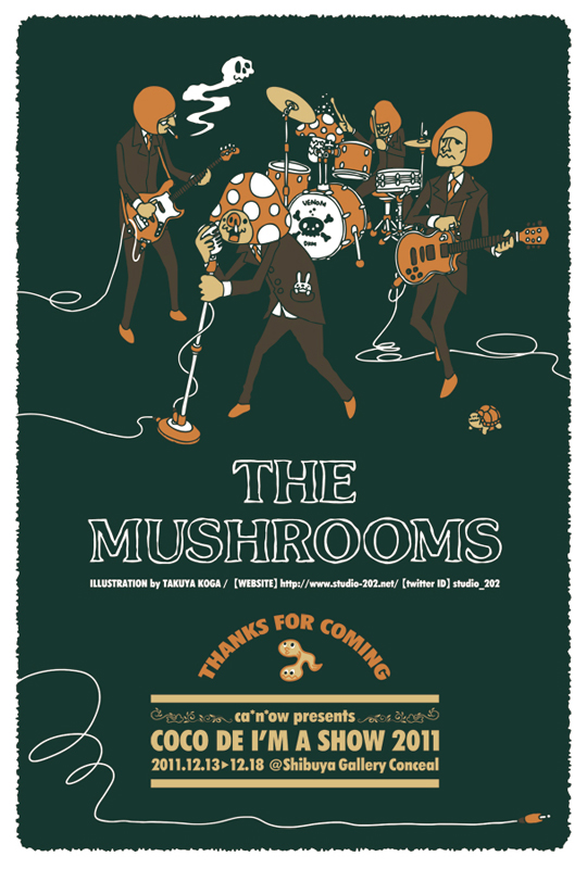 「ドクキノコまっしゅ」アンケート兼ポストカード。 展示へ来てくださった方へのプレゼントとして、アンケートを記入してくださった方にはこちらのイラストを進呈。 ポストカード下部がアンケートになっており、切り取って持ち帰っていただくという仕組みにしました。 他の商品との差別化のために、全く違うタッチで描画。